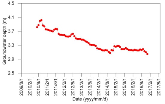 Long-term groundwater depth monitoring data at well W01 showed that the groundwater depth gradually decreased from July 2010 to December 2016 under the impact of the water transfer in autumn. The infiltrated surface water greatly increased the groundwater level. Within the same year, the overall groundwater depth fluctuated with greater depth from June to August (Figure 6).