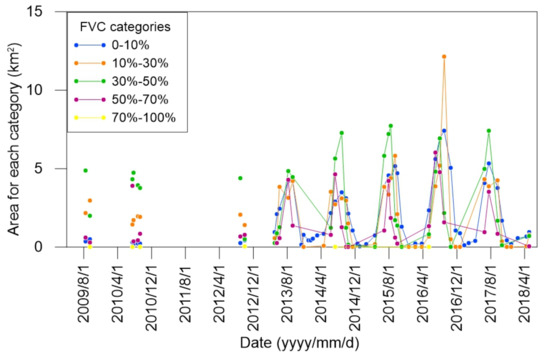 Variations over time of the vegetation coverage for different fractional vegetation coverage (FVC) categories in Qingtu Lake and its surrounding area within 10 kilometers. (Note: There is a lack of Landsat series satellite data from 2009 to 2013, among which there are only two data sets from August and September in 2009, four data sets from July, August and September in 2010, one data set from July, 2011, and two data sets from August and September in 2012).