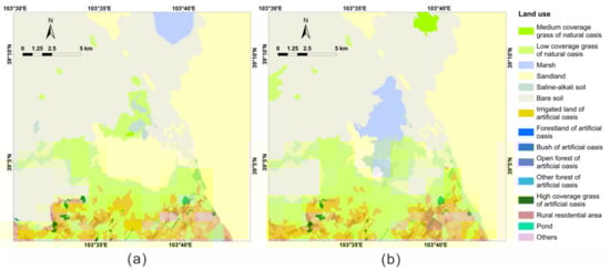 Figure 9 shows the variation of land use from 1970 to 2017. The obvious changes were in the marshes and low coverage of grass of the natural oasis, which was influenced by the lake area. The area of low coverage grass of the natural oasis increased while the sand area decreased, which was consistent with the variation in vegetation coverage around the Qingtu Lake wetland (Figure 8).