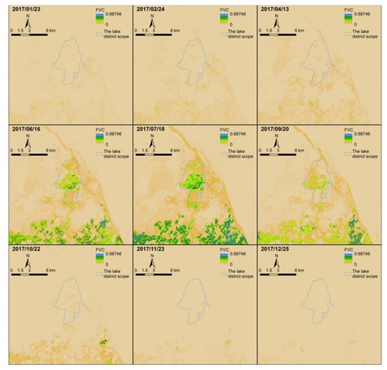 The temporal change pattern of vegetation coverage is similar for different years, and thus we only show the spatial distribution of vegetation coverage from January to December 2017 in Figure 10. The areas with high FVC are mainly concentrated in locations close to Qingtu Lake and the south side of the study area, and the FVC of these areas varies greatly with the seasons. In the entire study area, the maximum FVC reached 18.6% from January to April. The maximum FVC reached 67.7% in June. The maximum FVC reached 68.7% in July. The vegetation coverage began to decline after September. In October, the FVC was low, and only sporadic areas had an FVC of more than 30%, while other areas had an FVC of less than 20%. After that, vegetation coverage continued to decline. The FVC, except at Qingtu Lake and the south side of the study area, was lower than 15% for a long time.