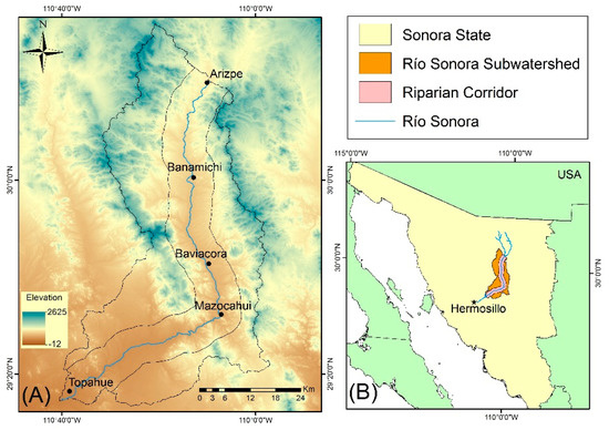 Location of study area. (A) Zoom in of the Riparian Corridor within the RSSW, elevation data shows large gradients along this stretch of the river. (B) Location of the Río Sonora Subwatershed (RSSW) within the state of Sonora.