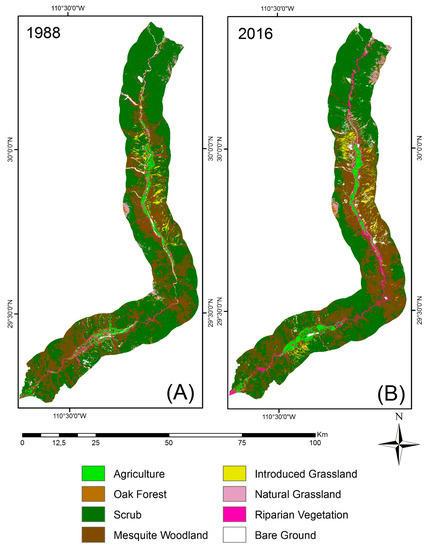 Thematic maps of Land Use Land Cover (LULC) in the Riparian corridor of the Río Sonora Subwatershed (derived from Landsat TM and OLI datasets). (A) Thematic map for year 1988. (B) Thematic map for year 2016.