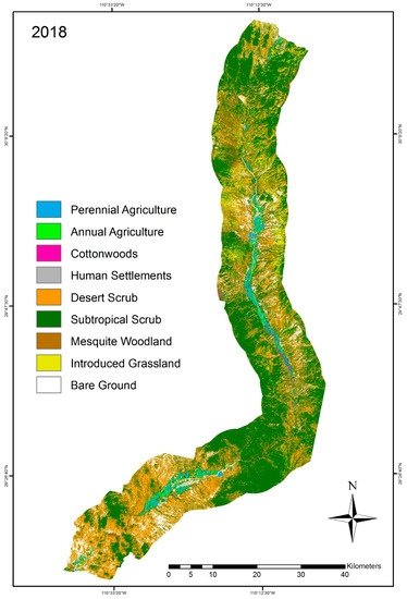 Due to the higher spatial resolution of PlanetSope-PS2 datasets, it was possible to establish a finer classification scheme by describing different subsets of classes [55]. The PlanetScope-PS2 scheme (Table 4) included two agricultural types (perennial and annual), two scrubland types (desert and subtropical) and two riparian classes (cottonwoods and mesquite). PlanetScope-PS2 datasets in this study were used mainly to assess the “recent state” condition of the riparian corridor, classes with a higher elevation distribution were dismissed from the scheme (oak forest and natural grassland), given the recent availability and reduced aerial extent of these scenes.