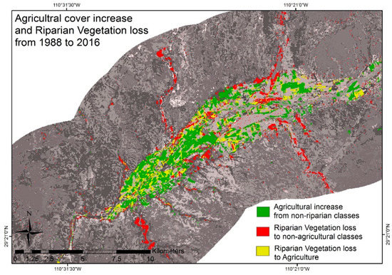 From 1988 to 2016, land cover classes associated with human activities, such as Agriculture and Introduced Grassland, show a significant increase of 30% and 60%, respectively. Bare Ground presents a 26% increase, which could be attributed to the expansion of the main rural communities (towns) along the river, as well as the opening of a silver–gold mine in the municipality of Banamichi in 2011. Riparian Vegetation also presents a considerable increase of 40%, with an important part of this occurring in the central section of the corridor, mostly within the municipality of Baviacora; this increase is also evident in the northern part within the municipality of Arizpe. Even when a significant increase represents the general cover trend for Riparian Vegetation, we could determine (from field experience and knowledge of the current riparian landscape) that most of it is composed of facultative riparian species and riparian shrubs. Thus, this percentage is not representative of obligate riparian species cover.