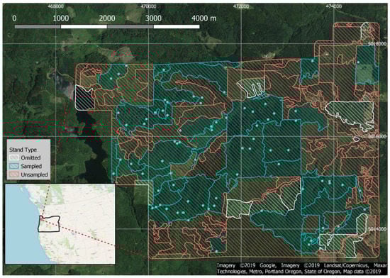 Vicinity map of the Panther Creek watershed situated in the northwest of Oregon, USA. Forest stands are colored according to omitted, sampled and unsampled. Field plots are indicated in blue. Universal Transverse Mercator (UTM) Zone 10 N coordinates are given at the margins of the figure, with UTM grid lines demarcated in gray.