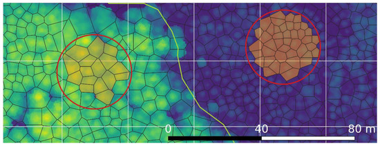 Canopy height model (blue to green background) displayed underneath delineated segments (black lines) and grid cells (white lines). Two example field plots are shown (red circles) with included segments shaded in orange. The green line in the center represents a stand delineation.
