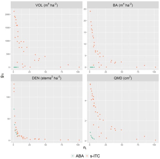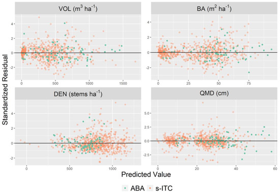 The standardized residuals of the eight models are displayed in Figure 3, and their parameter estimates are presented in Table 4. Figure 3 indicates some minor heteroscedasticity remaining in the DEN and the BA models for predictions exceeding 25 and 500 , even after the inclusion of the variance function, but otherwise the ABA and the s-ITC models appeared to have homoscedastic and symmetrically distributed residuals. ABA models appeared to have smaller residual variance than s-ITC for all attributes, i.e., their spread covered a smaller interval. Across population types, a number of differences in model parameter estimates were apparent, as reported in Table 4. For all inventory attributes, s-ITC models had consistently larger random effect variance estimates, i.e., , than the respective ABA models. Most notably, the ABA models for VOL and BA had near-zero estimates for . The variance function model term was consistent for VOL and BA but was not required (i.e., ) for the QMD model in the ABA case to correct heteroscedasticity. For the DEN ABA model, non-zero values of did not fully correct the heteroscedasticity beyond what was achieved with . None of the model residuals demonstrated strong spatial correlation after the inspection of empirical semi-variograms, thus we treated the errors of the unit-level observations as independent.