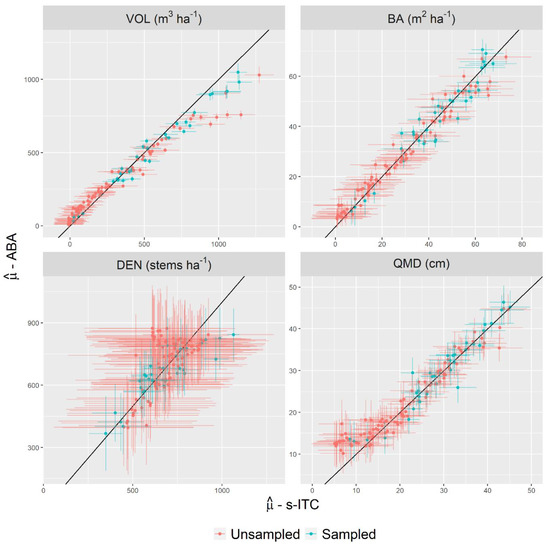 For each stand, we produced a prediction of the stand-level target parameter using the respective ABA and s-ITC models. This result conveys the level of coherence between the two alternative approaches and can highlight important differences in the models where they exist. Figure 4 displays these stand-level predictions and whether that stand was sampled. Between ABA and s-ITC models, a high level of agreement, i.e., the points in the figure clustered around the diagonal line, was apparent for VOL, BA, and QMD. For VOL, small differences existed at point predictions exceeding 500 , with the s-ITC model producing larger predictions than the ABA model. The differences were larger for unsampled stands than sampled stands. For BA, differences existed at the extreme small end of the predicted values, i.e.,, with the ABA model producing larger predictions than the s-ITC model. This same pattern existed for QMD occurring at predicted values . The differences between ABA and s-ITC models were most apparent for DEN. The grid cell model appeared to saturate at a level of 900 stems per hectare, with marked differences in the upper range of segment predictions. The confidence intervals for ABA, indicated by the vertical bars, and the confidence intervals for s-ITC reflected the uncertainty of each stand-level prediction. For VOL and BA, the confidence intervals were wider for the s-ITC models than for the ABA models. For DEN and QMD, the confidence intervals were relatively consistent between ABA and s-ITC models, i.e., they were approximately the same width.
