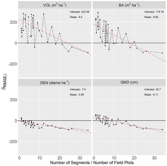 The ratio of the stand-specific sample size of segments to field plots plotted against , for VOL, BA, DEN, and QMD in sampled stands. A simple linear regression (red) was fit to each attribute to demonstrate the trend, with slopes and intercepts reported for each attribute.
