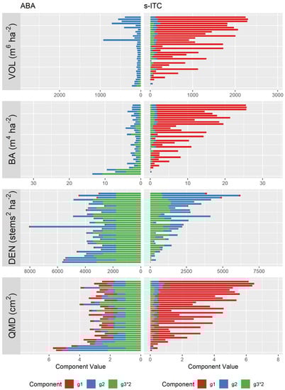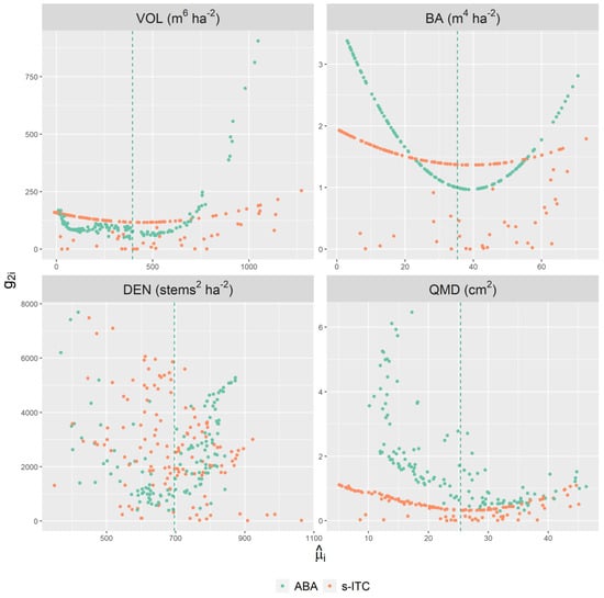 Figure 7 and Figure 8 display the error components and plotted against the stand-specific sample size , i.e., the number of field plots or number of segments, and the area-level prediction , respectively. The ABA models for all attributes tended to have smaller error components and, for models with small random effect variance estimates, such as VOL and BA models, these error components were uniformly small across all available sample sizes. In contrast, the s-ITC models, which tended to have larger random effect variances, required much larger sample sizes to achieve the same level for the component. For the component, it was apparent for VOL, BA, and QMD that predictions that tended to be far from the mean generally exhibited larger values for , especially for upper and smaller tails of the BA models and the upper tail of the VOL models. Some extreme values for were apparent for ABA VOL, BA, and QMD models in particular. Note that the distinct patterns for VOL, BA, and QMD in Figure 8 were the result of a fewer number of coefficients in these models and the form of the expression (Equation (15)).