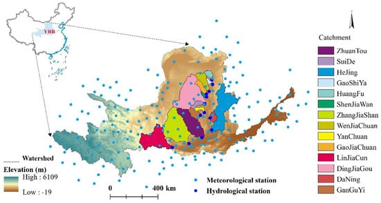 The Yellow River is the main source of water in northwestern and northern China. The YRB, a semiarid basin, is located between 95°E–119°E and 32°N–42°N, covering an area of approximately 7.95 × 105 km2 (Figure 1). The annual precipitation ranges from 140 mm yr−1 in the north to 1100 mm yr−1 in the east of the YRB, with an average value of 495.6 mm yr−1. Precipitation is concentrated in the summer months. The irrigation agriculture is developed, and there are four major irrigation areas along the Yellow River. In the midstream of the region, the ecological environment is fragile and land degradation is severe []. A series of ecological restoration projects have been implemented, such as nature reserves, the Three-North Shelterbelt, and the Grain to Green Program, of which the area covered by the Grain to Green Program is the largest among all of the ecological restoration programs [].