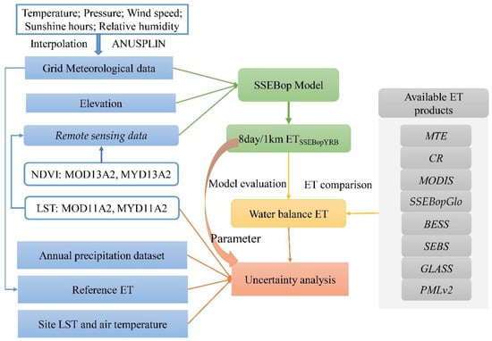 Figure 2 shows the framework for evaluating ETSSEBopYRB, which includes the input and output of the SSEBop model, evaluation of ETSSEBopYRB with water balance ET, comparison between ETSSEBopYRB and available eight ET products, and the uncertainty analysis of ETSSEBopYRB.