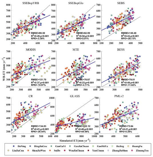 Evaluation of the annual ET for five small catchments (area >10000 km2) in ETSSEBopYRB and evaluation of eight other ET products during 2003–2015. The blue line is the fitted line and the black line is the 1:1 line.