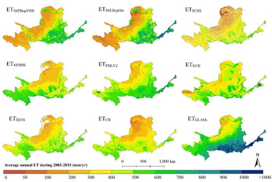 The spatial pattern of the average annual ETSSEBopYRB during 2003–2015 in YRB exhibited a notable high value in the east and low value in the west (Figure 4), which is similar to the findings for ETSSEBopGlo. The main difference between ETSSEBopYRB and the other seven ET products was concentrated on the upper YRB and irrigated farmland. In the upper YRB, the mean annual ET estimated by ETSSEBopYRB and ETSSEBopGlo ranged from 200 to 300 mm yr−1, while the estimated mean annual ET of the other seven ET products was higher than that of ETSSEBopYRB. For example, ETMODIS ranged from 600 to 700 mm yr−1, while the ETCR ranged from 400 to 600 mm yr−1 in the upper YRB (Figure 4). In the irrigated farmland located in the north (Figure A1), the mean annual ET values for ETSSEBopYRB, ETSSEBopGlo, and ETGLASS ranged from 500 to 700 mm yr−1, while the mean annual ET values estimated by the other six ET products ranged from 200 to 500 mm yr−1.