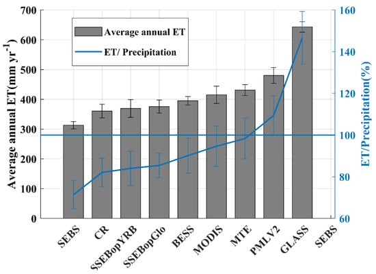 Mean annual ET values for nine ET products and the ratios of the mean annual ET to mean annual precipitation (ET/precipitation) during the years 2003–2015 over the YRB.
