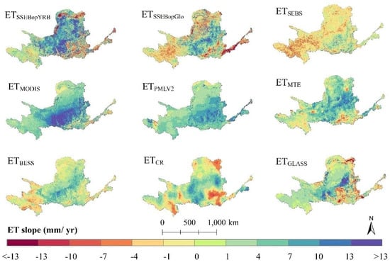 Annual ET trend comparison of ETSSEBopYRB and other ET products in the YRB during the years 2003–2015. The ET slope is the change rate of the annual ET, which is calculated using Equation (12).