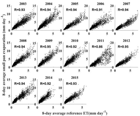 The reference ET is one of the most sensitive factors in the SSEBop model []. In this paper, we use the PM formula [] to calculate the reference ET with the eight-day average pressure, sunshine hours, wind speed, relative humidity, minimum temperature, maximum temperature, and mean temperature as inputs. The optimal interpolation method for each climate variable is different [], but each climate variable was interpolated using the same thin-plate spline function interpolation method, which may cause reference errors and affect the ET. Because the reference ET is strongly related to the pan evaporation [], the small observed pan evaporation in the station within the YRB from 2003 to 2015 was used to evaluate the reference ET. The results showed that the correlation coefficient of the eight-day average reference ET and small pan evaporation ranged from 0.86 to 0.95 (Figure 7), which indicated a strong relationship between the reference ET and the small pan evaporation. In the earlier research, three different methods, including the standard global PM formula [], revised PM formula in China [], and the revised PM formula in the YRB [], were used to calculate the reference ET in the YRB. The difference between the three methods focuses on the radiation term. The difference in the annual reference ET of the YRB simulated by the three methods is very small (Figure A3). Therefore, the uncertainty of the reference ET in this research cannot cause the large ET uncertainty simulated by the SSEBop model in the YRB from 2003 to 2015.