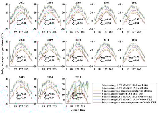 The 8-day average satellite LST, including MYD11A2 and MOD11A2, in the YRB can explain 92–96% of the 8-day average site LST during the years 2003–2014, except 2015 (Figure 8). The LST curve for MOD11A2 was abnormal in 2015, however MYD11A2 was not. The abnormal 8-day average MOD11A2 LST curves in 2015 were different from the eight-day LST curves in 2000–2014 throughout the YRB and on the meteorological observation sites, while the eight-day average observed LST curve and eight-day average observed air mean temperature curve were normal in 2015 (Figure 8). We assumed that the above phenomenon was due to the large missing values in MOD11A2 in 2015. However, after performing statistical analysis of the missing MOD11A2 ratio for the whole YRB and meteorological observation sites, we found that our assumption was wrong, because the missing ratio in 2015 was the same as the missing ratio during the years 2003–2014 (Figure A7). We concluded that the MOD11A2 product could not characterize the YRB’s eight-day average LST variability in 2015.