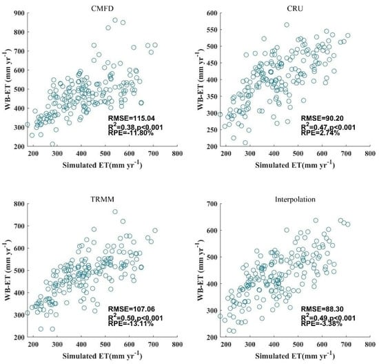 There are also some free global coarse resolution precipitation products, such as TRMM3b42 derived from remote sensing satellites [] and reanalysis data of CRU [], while the Chinese precipitation product from the China meteorological forcing dataset (CMFD) integrates ground observations, satellite data, and reanalysis data []. ETSSEBopYRB can explain 38%, 47%, 50%, and 49% of the WB-ET based on the CMFD, CRU, TRMM3b42, and the interpolation of the annual precipitation, respectively, during the years 2003–2015. In the \ RMSE and RPE indices, there were lower RMSE and lower RPE values for WB-ET based on interpolation than for WB-ET based on the other three precipitation products (Figure 9). Therefore, the WB-ET used for evaluation will have a great impact on the evaluation results because of the differences in annual precipitation data.