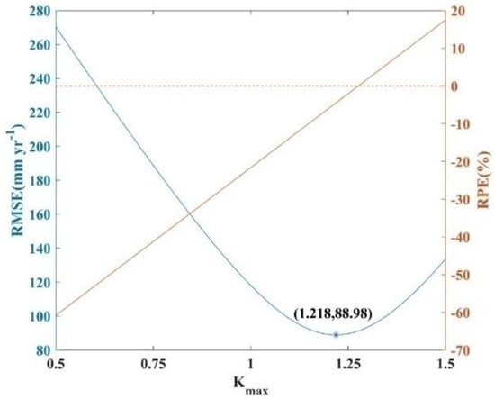 The model parameters of coefficient involving the magnitude of the estimated ET are additional sensitive and critical factors in the SSEBop model []. The coefficient factor was recommended to be set at 1.2 in the original research []. Later, Chen et al. (2016) recommended that the coefficient range should be from 0.95 to 1.2, and that it was acceptable to take the coefficient as 1.1, since its maximum error of 15% leads to an ET uncertainty of approximately 15% []. Senay et al. (2018) highly emphasized the correction of this factor in the applied research region using the WB-ET or site observation ET []. In this research, through the correction using WB-ET in 2003–2014, the coefficient was set as 1.218 (Figure 10). When the coefficient was 1.2168, the RMSE (88.98 mmyr−1) between the WB-ET and ETSSEBopYRB (the LST input is MOD11A1) during the years 2003–2014 was lower than the other f setting, while the RPE (−4.49%) for ETSSEBopYRB was small.