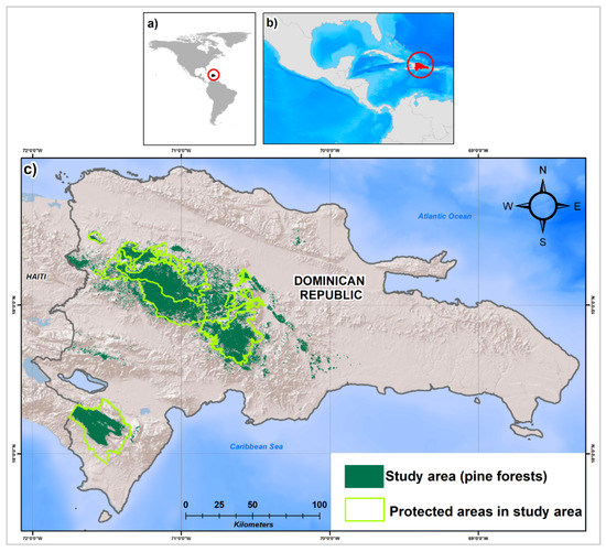 Study area (a) general location of the Dominican Republic, (b) regional location, and (c) study area including the protected areas.