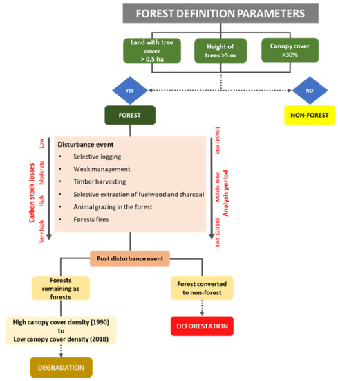 Based on the definition of forest described above, in the current study, forest degradation is defined as “the loss of carbon content in forest lands that remain as forest lands with a decrease in canopy cover that does not qualify as deforestation and that can be caused by anthropogenic activities”. Forest degradation has a human-induced negative impact on carbon stock changes; our operational definition for measuring forest degradation is based on indicators, such as forest structure (changes in canopy cover) [34] that affect the ability of the forest to store carbon under natural conditions [35]. These definitions demonstrate that deforestation and forest degradation involve different conditions, processes, and concepts. Deforestation suggests a change in land use from forest to non-forest land use, altering the original structure and environment of the forest, while degradation occurs in forest lands that are maintained as forest lands but suffer losses in their forest ecosystem functions (Figure 2).