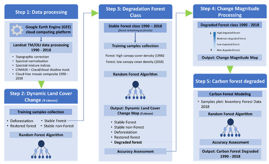 Our models were developed using the Landsat Thematic Mapper (TM) and an operational land imager (OLI) by applying the RF algorithm in GEE to generate a dynamic land cover change map, degraded forest map, and carbon forest map. The model was trained and validated using sample plots from the forest inventory and satellite images.