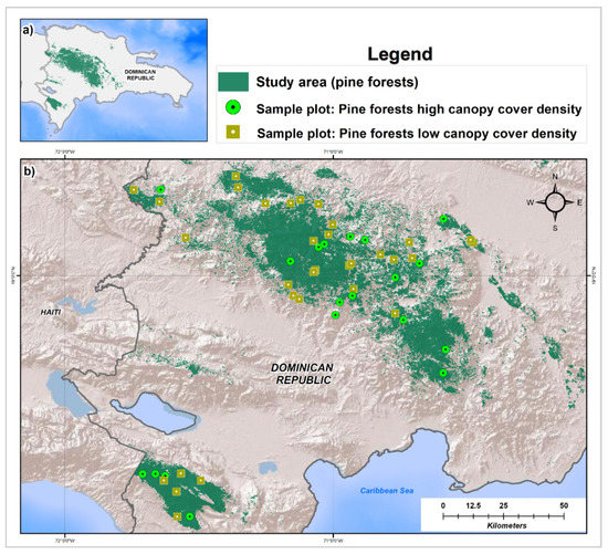 (a) General location of the Dominican Republic; (b) location of permanent plots in pine forests with low and high canopy cover density.