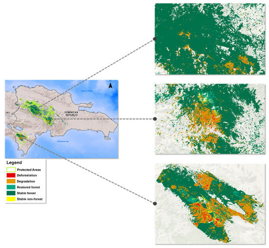 We analyzed the dynamics of land cover change, as they relate to the country’s protected areas, and identified that 71% of the degraded pine forests exist within the protected area. Among these, the main forest belongs to Sierra de Bahoruco National Park (NP), with 14,166 ha (30% of the total degraded area), followed by Valle Nuevo NP and José del Carmen Ramírez NP, with 8,736 ha (18% of the total degraded area) and 6,462 ha (16% of the total degraded area), respectively. Table 5 shows the locations of the protected areas with the degraded pine forests from 1990 to 2018. A geographic representation of the dynamic land cover change map obtained in our study is also provided (Figure 9). Detailed results on land cover change are available via a dashboard called “Accuracy assessment and analysis tools” available in Appendix A.