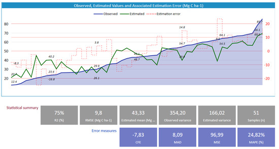 Cross-validation (CV) is one of the most commonly used techniques to evaluate the efficiency of a machine learning (ML) technique; this is due to its wide application in the scientific arena and its efficiency in detecting a model’s overfitting problems [63]. To evaluate the performance of the machine learning model applied to map the change magnitude and forest carbon, the following functions were used: coefficient of determination (R2), mean square error (MSE), root mean square error (RMSE), mean absolute deviation (MAD), cumulated forecast error (CFE), and mean absolute percentage error (MAPE):