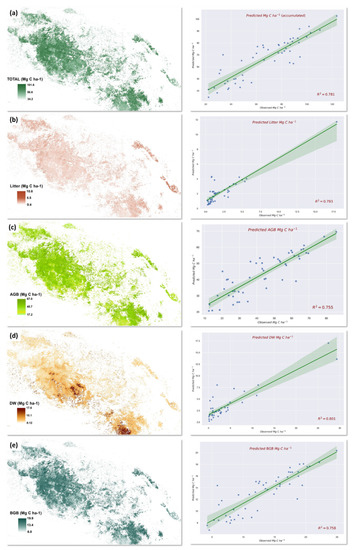For each plot, four of the five C pools were measured [55]: aboveground biomass (AGB), belowground biomass (BGB), deadwood (DW), and leaf litter (Table 1) [47,56,57] (See Section 2.4.2 Field Inventory Data for more details). To convert the biomass to carbon, the IPCC default carbon factor value (0.47) was used. Each pool was modeled independently using spectral responses (vegetation indices) from Landsat, applying a regression model with the RF algorithm in GEE (ee.Classifier.randomForest(30).setOutputMode(‘REGRESSION’). Through this process, each spatial pixel acquired an AGB (t C ha−1) value and its related standard deviation as a measure of uncertainty. The code generated to model the C stock using the GEE is available in Appendix B.