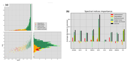 Classes that were determined in the dynamic land cover map correspond to a stable forest, stable non-forest, degradation, deforestation, and restored forest. Seven different vegetation indices were used to monitor the dynamics of forest change during the 1990–2018 period. Among the most relevant indices used are the enhanced vegetation index (EVI), which was designed to enhance the vegetation signal with improved sensitivity in high biomass areas [50]; the soil adjust vegetation index (SAVI) [51]; and the normalized difference fraction index (NDFI), which was constructed to highlight degraded or cleared forest areas. The NDFI values in intact forests are expected to be high (i.e., approximately 1) due to the combination of high “green vegetation” (GV) and low non-photosynthetic vegetation (NPV) and soil values [52]. The spectral indices used are closely related to the land cover defined in our research; Appendix C, Table A1 details each index used.