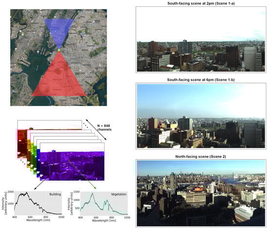 To build our models, we use data from two separate UO-deployed VNIR instruments that were sited atop a tall ∼120 m (∼400 ft) building in Brooklyn with both North- and South-facing vantage points and aligned horizontally as seen in Figure 1. These instruments were both single slit scanning spectrographs with 1600 vertical pixels and a characteristic spectral resolution (FWHM) of 0.72 nm, though they have slightly different spectral ranges. The North-facing VNIR was sensitive from 400.46 nm to 1031.29 nm in 872 spectral channels while the South-facing VNIR was sensitive to 395.46 nm to 1008.06 nm in 848 spectral channels. These instruments acquired 3 urban scenes: two south-facing images covering Downtown and North Brooklyn (one at 2 pm and one at 6 pm on different days, henceforth referred to as Scene 1-a and Scene 1-b respectively) and one north-facing image (Scene 2) of northern Brooklyn and Manhattan. Given the different spectral ranges and horizontal fields of view (set by the range of the panning of the spectrograph), the shapes of the datacubes (# row pixels × # column pixels × # wavelength channels) are for Scenes 1-a and 1-b as depicted in Figure 1, and for Scene 2. Figure 1 also shows composite RGB images of the three scenes produced by mapping the 610 nm, 540 nm, and 475 nm channels to the red, green, and blue values respectively.
