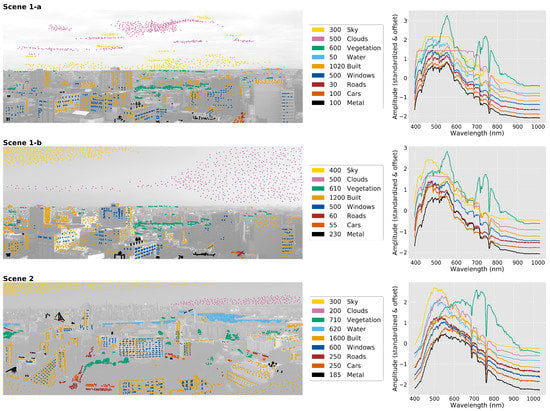 For the purposes of training the models described below and evaluating their performance, ground truths were obtained via a subset of pixels from each UO HSI image that were manually classified into the following classes: Sky, Clouds, Vegetation, Water, Building facades, Windows, Roads, Cars, and Metal structures. Please note that in order to generate a balanced training set on which to train our machine-learning algorithms, we do not randomly select pixels from the scene to hand label. Doing so in this case would result in a sample heavily biased towards classes of materials that dominate the image—for example, sky and cloud pixels constitute ∼50% of pixels in Scenes 1-a and 1-b as shown in Figure 1. Therefore, 3200, 3555, and 4705 pixels in Scenes 1-a, 1-b, and 2 respectively were manually selected and labeled. Figure 3 shows the positions of the manually classified pixels superimposed over the images, together with a list of the number of pixels classified as each class of objects and materials. The figure also shows the mean (standardized) spectrum of each class of pixels in each scene. Due to lack of visibility from atmospheric conditions in Scene 1-b, no Water pixels were classified.