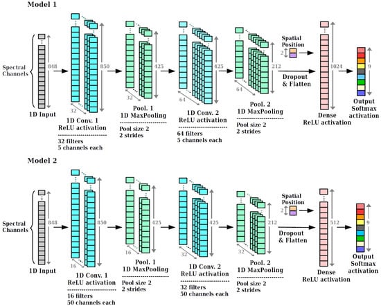 We perform our classification task with two CNN models (hereafter Model 1 and Model 2) that have identical architecture, but with different numbers and widths of their convolutional filters. The choice of filter parameters for the two models in the hidden layers is determined following the procedure described in Section 3.1 and explored further in Section 3.2. Their architecture is shown in Figure 4 and consists of a 1-dimensional input layer of 848 spectral channels, followed by two convolutional and max-pooling layers. Please note that the HSI datacubes provided in this work do not contain the true geographic positions of each pixel in the images, therefore the only spatial information that can assist in the classification tasks is that of the row and column coordinates of each pixel in the image. Hence, the output of the two convolutional and max-pooling layers is flattened and concatenated with 2 spatial components (fractional row and column coordinates), which then become the inputs to a fully connected layer (see Figure 4). Therefore, even though the initial input to the CNN is the 1D spectrum of each pixel, this full connectivity with the spatial coordinates towards the end of the network implies that the location of the pixel in the image is integrated with all wavelengths by the model. This fully connected layer is then followed by an output layer of 9 neurons representing the 9 possible manually classified material types. A ReLU (Rectified Linear Unit) [48] activation function was used in each convolutional and fully connected layer, and a SoftMax activation was applied to the output layer to estimate relative probabilities for each classification.