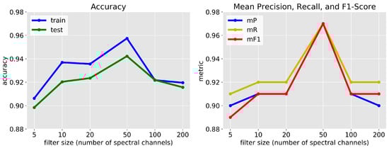 Accuracy of training and testing instances (left), and weighted average precision, recall, and Measure (right) of testing instances from the CNN model trained and tested on Scene 1-a with filters of different kernel sizes in the two convolutional layers. Maximum performance is obtained from kernel size 50, indicating that in general, it is the spectral features of size ∼35 nm that optimally discriminate between classes in urban scenes.