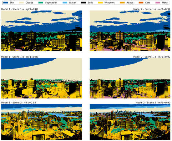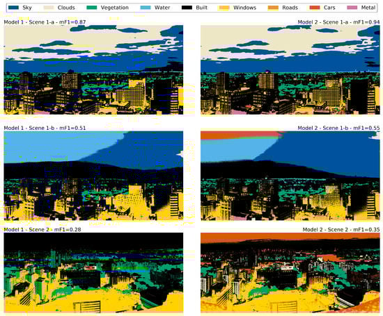 Comparing the results of the transfer of both models in Figure 9 with those from training on each image individually in Figure 6, it is evident that transferring the models that were trained on Scene 1-a to Scenes 1-b and 2 caused a significant reduction in performance relative to models trained on each image independently. Qualitatively, the results of transferring both Model 1 and 2 to Scene 1-b resulted in the misclassification of almost all pixels above the horizon, as well as significant confusion in the human-built materials that are in shadows. These misclassifications are even more prominent when transferred to Scene 2 where the entire image is dominated by either Building or Window classifications from both models. These results are reflected in Table 4 where for Scene 1-b, the mean score for Model 1 drops from 86% (self-trained) to 51% (transferred from Scene 1-a). For Scene 2, the drop in mean is from 82% (self-trained) to 28% (transferred from Scene 1-a). As shown in Section 3.2, Model 2 performed significantly better on the classification tasks in general and this is also the case for transferred models. The transferred Model 2 performed better than the transferred Model 1 with mean scores of 55% and 35% on Scenes 1-b and 2, respectively. Finally, while metrics for almost all classifications dropped when transferring both models to the testing images, the classification of Vegetation pixels remained high and constant (see Section 4.3).