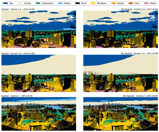 It is difficult to discern qualitatively which of the two model variants (with or without spatial information) in Figure 7 performed better at segmenting a given scene; however, some examples of the differences include the increased accuracy in classifying windows in the buildings in the lower left corner of Scene 1-a, as well as the misclassified cloud pixels on the horizon of Scene 1-b. Nevertheless, Table 2 shows that excluding spatial features resulted in a reduction in the performance of a given model. This reduction in performance is largely attributed to the decrease in classification performance of human-built materials while performance on natural materials remained near 100%. These results are further discussed in Section 4.2.