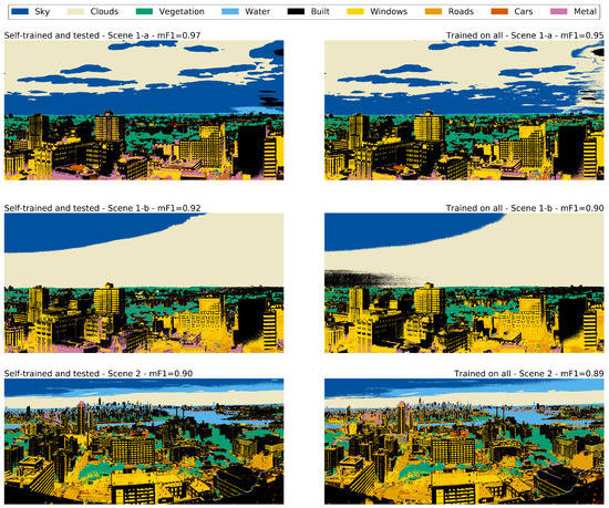 In general, the self-trained models that are trained on each image separately perform better than this “all”-trained model trained using all three images simultaneously. In Figure 8 some examples of the self-trained models outperforming the all-trained model are seen in the middle of Scene 1-a where the windows are more accurately identified than in the all-trained model. In Scene 1-b the sky on the horizon at the left of the image is classified as buildings by the all-trained model, and in Scene 2 much of the buildings close to the horizon are misclassified as Water. Nevertheless, Table 3 shows that overall, self-trained models exhibited classification performance no more than 2% greater in terms of the mean metrics than that of the all-trained model. On a by-class basis, both model variants identified the natural materials (i.e., Sky, Clouds, Vegetation and Water) with equal and almost perfect precision and recall in every image. The marginal difference in the overall performance is entirely driven by the difference in classification of the human-made materials. This result indicates that natural materials can be generalized by training on all available scenes to their distinct spectral features and remain detectable regardless of given scene. Human-built material classes on the other hand, have spectral features that are highly dependent on illumination conditions, therefore generalizing these features by including training examples under different illumination conditions to the same model results in reduced classification accuracy when testing on each image individually.