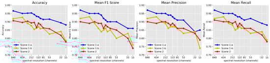 Accuracy and the weighted average of the measure, precision, and recall (left to right respectively) of CNN Model 2 trained on labeled data for each scene with varying spectral resolutions. The performance shows a decreasing trend with decreasing spectral resolution in all three scenes, with the model trained and tested on Scene 1-a outperforming Scenes 1-b and 2 at all spectral resolutions.
