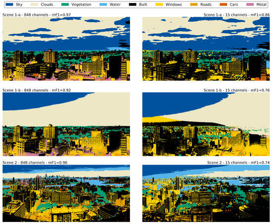 Figure 10 shows the resulting performance (over all classes) of the models with decreasing spectral resolution. As before, training on Scene 1-a results in models that perform better on the training set than on Scenes 1-b and 2, and this holds for all spectral resolutions. In addition, as expected, the overall performance of the model generally decreases as the spectral resolution is decreased, with significant reductions in performance at spectral resolutions below 85 spectral channels. The difference in performance between the model trained on full resolution spectra (848 channels) as opposed to the lowest spectral resolution (15 channels) is seen in the segmentation maps in Figure 11. Comparing the two, it is evident that the model trained on the higher resolution spectra in all three scenes resulted in greater classification accuracy than that using lower resolution spectra. This is more prominent in Scenes 1-b and 2 which show a decrease in mean score of 16% as the spectral resolution is decreased than in Scene 1 for which the effect on mean score is 11%. Some example misclassifications are evident in Scene 1-b at the left horizon where the model has misclassified Clouds as Buildings and Windows, as well as on the right were all classes covered in haze are classified as Clouds. In Scene 2, more of the Sky and Clouds are misclassified as Water in the lower resolution spectra than the one at full resolution, and the majority of material classes on the left side of the image are misclassified as Windows.