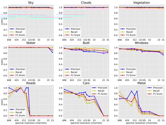 Figure 12 shows the per class performance of the model trained and tested on Scene 1-a with incrementally decreasing spectral resolution, and we find that the metrics for the classification of Building facades and Windows decreases continuously as the spectral resolution is decreased. Moreover, the classification of the other human-built structures (Roads, Cars, and Metal) show fluctuations in performance for higher spectral resolution, but with a generally decreasing trend, and dropping to no detection for resolutions of 122 channels and below for Roads and Metal, and 22 channels and below for Cars. Sky, Cloud, Vegetation, and Water pixels have consistently high rates of correct classification for all spectral resolutions with scores > 0.99 for spectral resolutions of 22 channels and greater, with Sky and Water dropping to a minimum of 0.97 and 0.91 (respectively) at 15 spectral channels. The precision of classification of Vegetation pixels on the other hand remained at 100%, recall above 97%, and score above 0.98 regardless of spectral resolution. These results are further discussed in Section 4.4.