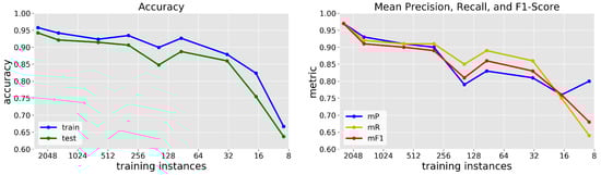 As with all machine-learning models, CNN model performance is dependent on the availability of a sufficient number of manually classified instances on which to train. Generating such ground truth data is often costly and time-consuming and—given that we have shown above that 1-dimensional CNN models trained to segment VNIR hyperspectral images cannot be easily transferred from one scene to another—it is important to assess precisely how many pixels must be manually labeled to achieve the segmentation results described above. Therefore, in this section the goal is to investigate the dependence of the performance of Model 2 (see Figure 4), trained on Scene 1-a at full spectral resolution, on the number of training instances available for all classes. To that end, the model was retrained with different train-test splits of the available manually classified pixels.