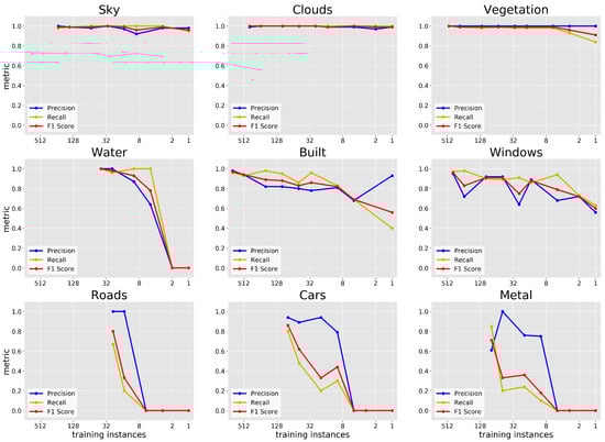 Sampling strategy for obtaining fair and sufficiently representative training examples is a widely discussed topic in the literature [45,46,47]. In addition to the sampling method described in this work, we attempted various approaches to selecting our training sets including: (a) using equal numbers of samples of Sky, Clouds, Vegetation, Building facades, and Windows (300 samples each), excluding the classes with 100 or less labeled examples, and testing on only those samples represented in the training set; and (b) using equal numbers of samples of Sky, Clouds, Vegetation, Building facades, and Windows (300 samples each) and including the classes with 100 or less total number of labeled examples. In both cases, the resulting performance of the models were within 1% of the scores of the models presented in this work, both overall and on a by-class basis.