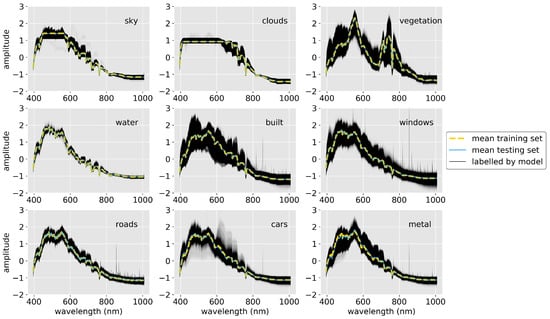 Taken together, our results indicate that simple 1-dimensional convolutional neural networks applied to ground-based, side-facing remote hyperspectral imaging at very high spectral resolution can be trained to classify and segment the images to high accuracy with relatively few training examples. However, transferring pre-trained models to other scenes with different viewpoints or with different illumination conditions requires either retraining or—potentially—more complex CNN models. Some application domains that can benefit from the use of CNNs to classify materials in urban areas include land use monitoring over time, monitoring urban sprawl, and correlating urban structure types (i.e., built-up areas, impervious open spaces, urban green spaces, etc.) with environmental variables and factors for human well-being. Moreover, future studies aimed at identifying vegetation and green spaces in urban areas can benefit from the findings in this work that show that vegetation can be identified in urban environments with models trained on a single image, with low spectral resolution, using a small number of labeled examples.
