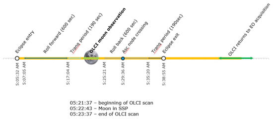 After the roll of the spacecraft was stabilized, the instrument was turned on in nominal Earth Observation mode. The instrument was collecting samples for 2 min with the moon coming into view roughly in the middle of this period with a phase angle of −6.45°. The timeline of the maneuver is presented in Figure 2. The calibration window was selected to make sure that the moon was as close to the middle of the swath as possible to avoid possible negative effects that may occur close to edges of the camera field of view (FOV). Additionally, one of the objectives was to capture all possible stray-light pixels.