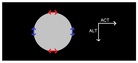 Synthetic representation of the OLCI-B moon observation showing the interfaces between bright and dark zone, which are aligned with along-track (ALT) direction (blue arrows) or across-track (ACT) direction (red arrows).