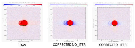 Oa20 moon radiance (left) without stray-light correction, (middle) after nominal correction, (right) after correction using the iterative method. Color scale is linear, centered on zero (deep space value) and limited to stray-light radiance levels (i.e., the moon disk is saturated); red is for positive, white for close to 0, blue for negative radiance. On the left plot, a black circle has been drawn to visualize the moon disk better.