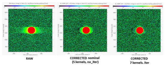 Stray-light correction was tested with these two additional kernels on the moon data, and very promising results were obtained, especially when coupled with the iterative method (described above). As illustrated in Figure 5: the green ACT pattern present on both sides of the moon (left plot, left and right of the moon disk) is residual NIR scatter stray-light: it almost completely disappears when using seven kernels and iterative method (right plot).