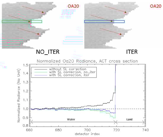 Figure 6 illustrates the improvement brought to Oa20 by the iterative method applied on an OLCI-A Earth Observation. It shows that, as for the moon observation, overcorrection next to the ACT bright/dark transition (here water/land) was significantly reduced.